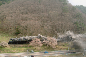 D51も峠で15分ほど遅れたようで、中山トンネル (鉄道は沼上トンネル) 手前でSLの最後尾を捕捉するくらいまで追い上げたところで渋滞、車がまるっきり進みません。