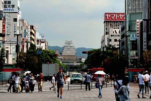 姫路駅を北側に出ると、正面に姫路城が見えます。初めて姫路に降り立った人間には、なかなかシュールな光景です。