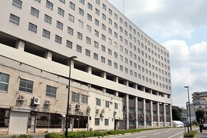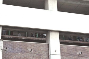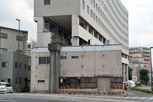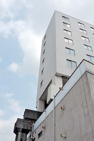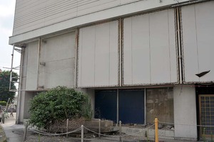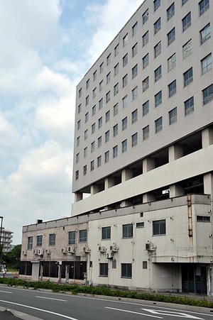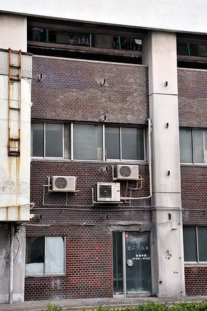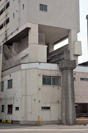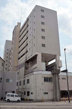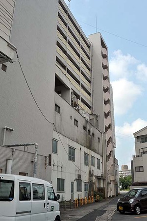■建物の南側 遠目には綺麗な建物に見えても、外壁の痛みや、上層階の至る所の窓ガラスがテープで補修されているのが見て取れます