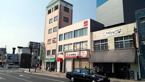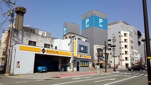 ミソになるのはビジネスホテルのフロント付近。構造的には、ガラス戸を入って右に折れてすぐ (の所のさらに右側) に、住居用のエレベーターと階段があるはずです。