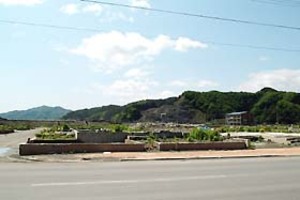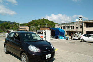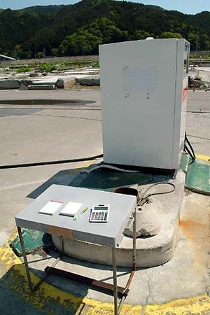 ■ガソリンスタンド前は悲しい光景が広がっていますが、でも頑張っておられます。手前の道路は国道(バイパスは別にあり)で、復興作業の工事ダンプが頻繁に行き交うほか、交通量は結構あります