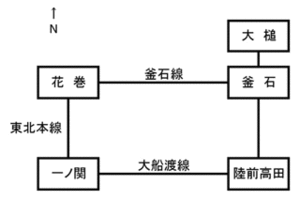 かなり端折っていますが、大きくは狂っていないはず。長方形の、左上(花巻)を経由するか、右下(陸前高田)を経由するかの違いなので、距離的にはあまり変わらず