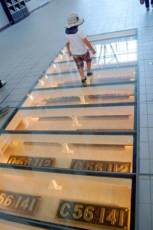 入場ゲートを通って館内に足を踏み入れると、まずは床下のナンバープレートがお出迎えします。