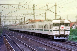 当時の勝田電車区の485系は各地から集めてきたボンネット車が君臨し、前面の塗り分けも「赤スカート」やヒゲの有り無しなどまちまちで興味深いものがありました。しかしこのころから徐々に“勝田仕様”に統一され始めたため、僅かな時間にオマケの一発をやったようです。