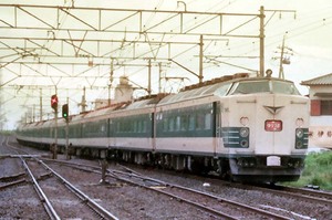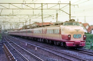 ■1985-8-11(日) 藤代 485系 特急「ひたち」下り列車。ヒゲなし赤スカートのボンネット