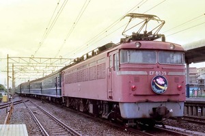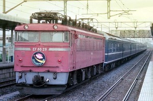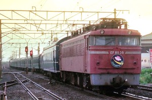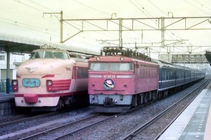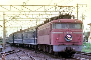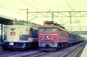 ■1985-8-11(日) 折り返し発車待ちのEF8029「エキスポドリーム(回送)」と、通過する上野行583系「ゆうづる」