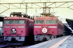 ■1985-8-11(日) 藤代 EF8029「エキスポドリーム(回送)」の横を、EF8152「エキスポライナー」が通過し、一瞬の並び。ここは交流区間ですが、車上切替をしてきたばかりのEF8152は次の停車駅・万博中央まで両パン運転