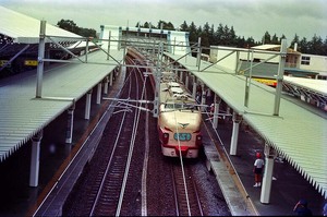 ■1985-8-11(日) 万博中央 485系「ひたち」。上下ホームを連絡する跨線橋からの撮影で、これは上り列車。特急は万博中央には停車しませんでした