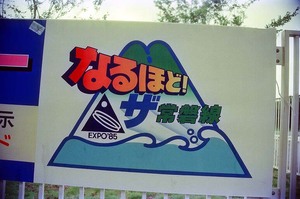 ■1985-8-11(日) 万博中央 なるほど! ザ 常磐線。当時フジテレビ系列で「なるほど! ザ・ワールド」という、クイズ形式の情報番組が人気を博していて、巷では「なるほど! ザ・○○」という言い回しが「はやりかけ」ました(流行ったとまでは言えないでしょうね)。で、この看板が何なのかは不明