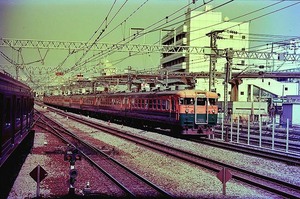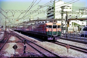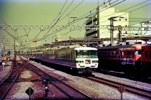 185系200番代「踊り子」。本来の185系0番代「踊り子」は、車体中央に斜めストライプという塗装ですが、「新幹線リレー号」の任を解かれた200番代が何本か田町電車区に転属し、しばらく横帯のまま「踊り子」運用に就いていました。それにしても、さっきの167系の戻りがカブってる・・・