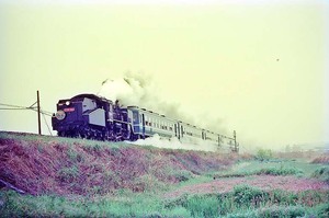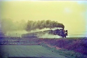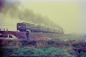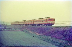 国鉄急行色キハ58にキハ35。現代の感覚だと、リバイバル列車か何かのイベントと錯覚しそうですが、これはイベントでも何でもない、当時の平凡な日常です。こんなのがごく普通に走っていました。SL特需で増結していたのか、一部の駅ではホームにかからない車輌がありました(それでもドアは開く)。