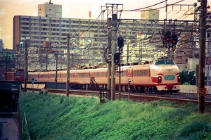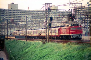 1988年9月21日(水)、EF8195牽引のモカ座「ふれあいみちのく」を江戸川土手の東京側にて。