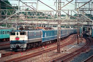 ■1989-8-11(金) 鶯谷-日暮里 回8406列車 臨時急行「おが」(上野5:59着) の推回 EF651011 (20系x9)