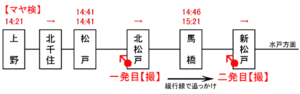 それでも北松戸で撮っているということは・・・快速線のダイヤは覚えていませんが、おそらく絶妙のタイミングに快速(または中電)があったのでしょう。北千住から松戸まで快速(同)に乗ってワープする間に、北千住14:25発の緩行を僅かに追い抜き、松戸でその緩行に飛び乗ったものと思われます。