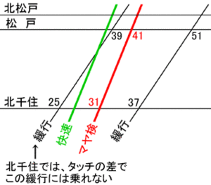北千住〜松戸間の、快速線と緩行線の所要時間差は4分程度。ですが、4分って結構大きいものですね。