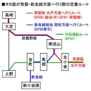 Aタカ座という呼び方から分かるとおり「やすらぎ」は高崎運転所のお座敷客車で、これが常磐線方面に行くときは武蔵野線〜北小金経由が定石です。房総方面に行くときは 武蔵野線〜馬橋〜金町〜新金線経由となり、この場合の機関車はEF65で事足ります。