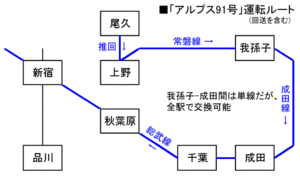 このルートを定期列車に乗って辿ろうとすると、乗換が必須の上に列車本数が少ない区間もあり、しかも距離的には大回りになるため、あまり実用的とは言えません。しかし、こと客車列車の回送ルートという観点では (尾久〜上野間の推回は別として) 進行方向が一切変わらず、まったく機回し無しに営業列車「アルプス91号」の運転に就くことができる“アイデア賞”モノです。