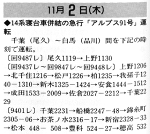 1989年の秋臨では、中央本線の臨時急行「アルプス91号」が、千葉22:31発→白馬7:12着として設定されました。しかも14系客車 (寝台2輌+座席4輌) です。