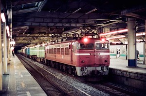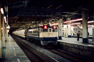 列車は、ずいぶんとカッ飛ばして来た記憶がありますが、標準レンズで絞りf1.4開放で撮影しているでしょうから、シャッター速度は 1/250か、もしかすると 1/500くらい切っていたのかも知れません。レリーズ位置が早かったのはともかくとして、露出的な面では結構よく写っているものです。