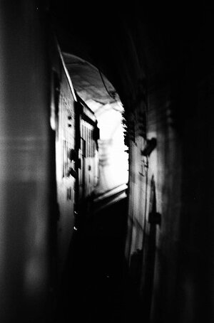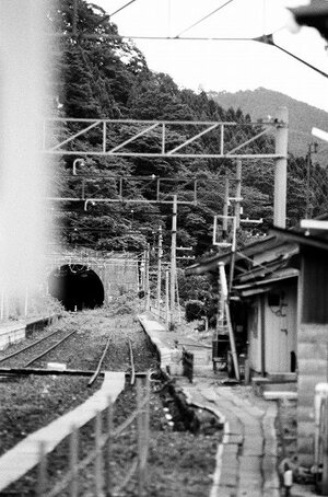 ■1990-8-6(月) 赤岩駅停車中 (420列車々内より) 名物だった4駅連続スイッチバックのうち、もっとも福島寄の赤岩は一足先にスイッチバックが廃止されていました。(左)振り返って山形方向(旧)下り線の第二赤岩トンネル (右)進行左側窓より旧赤岩駅