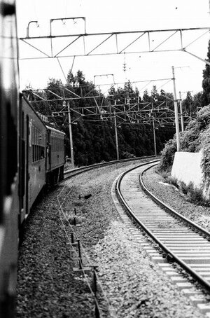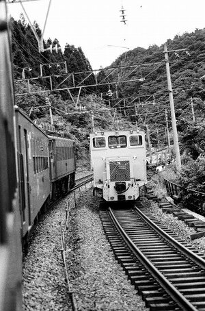 ■1990-8-6(月) 板谷-赤岩 (420列車々内より) 下り線は改軌工事のため閉鎖されており、営業列車は(旧)上り線を使用した単線運転となっていました