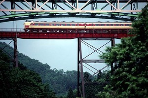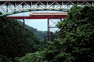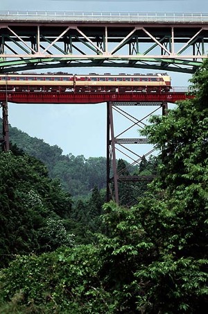 本当は鉄橋の真下近くに行き、見上げるような感じで撮りたかったのですが、この深い谷。下り方がよく判らず、大迂回したあげくにここが限界でした。